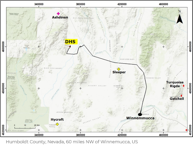 Epithermal gold-silver deposits of the quartz-adularia type at the DHS project were emplaced in a local Jerry Creek Permian volcano-clastic field. The potential deposit should be a combination of high-grade bonanza veins, medium grade breccias, and lower grade dissemination. High-grade banded veins (up to 0.9 opt Au) should be located west and within historic drilling intercepts, but zones with less than 0.1 ounces per ton (oz/ton) gold also are significant and probably would constitute ore elsewhere without the veins (historic intercept cover by alluvium). Silicified hydrothermal breccias could be an important host associate with structures cross.